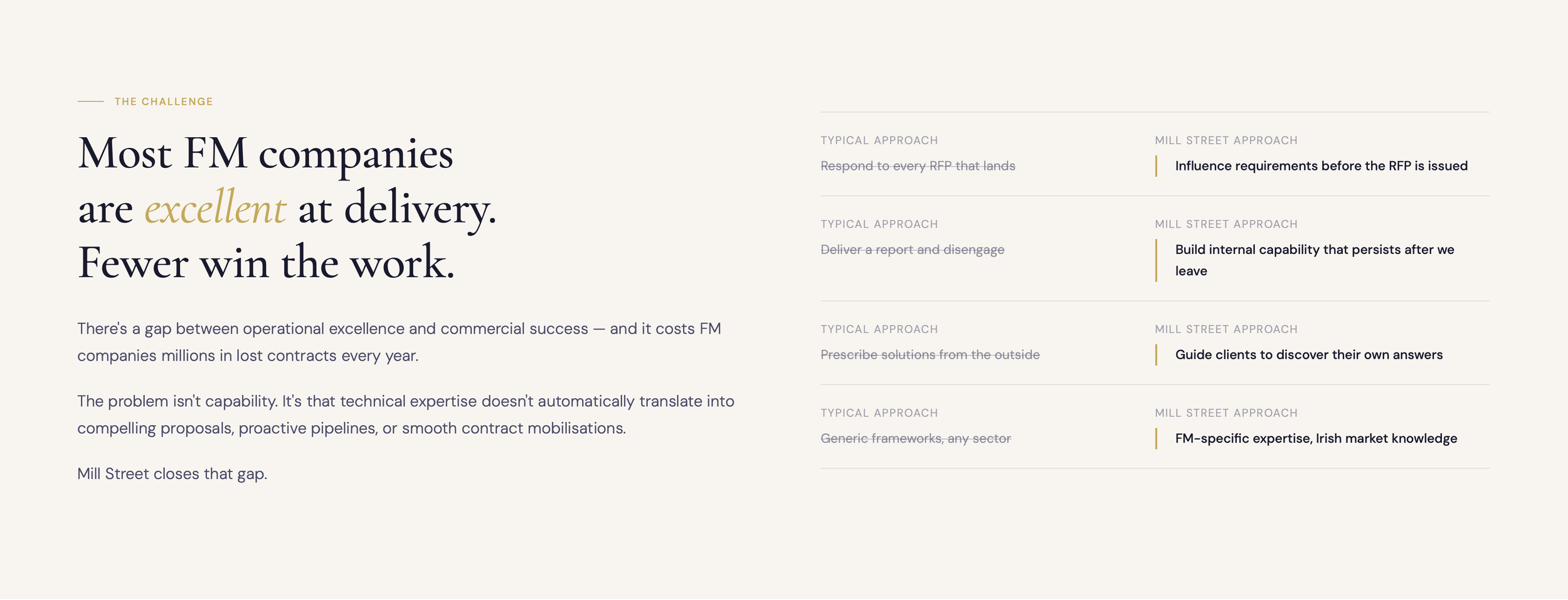 Mill Street helps FM companies move from reactive RFP responders to proactive business developers — through strategic coaching, transition management, and bid support that actually sticks.